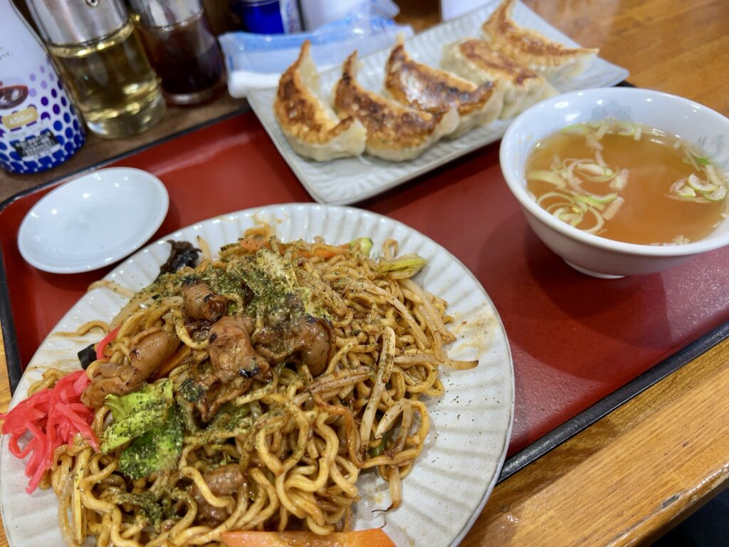 ご当地グルメの辛モツ焼きそば850円と、セットにすると350円で焼き餃子か、半チャーハンか、水餃子をつけれるようなので、町中華の定番焼き餃子をオーダーしました。