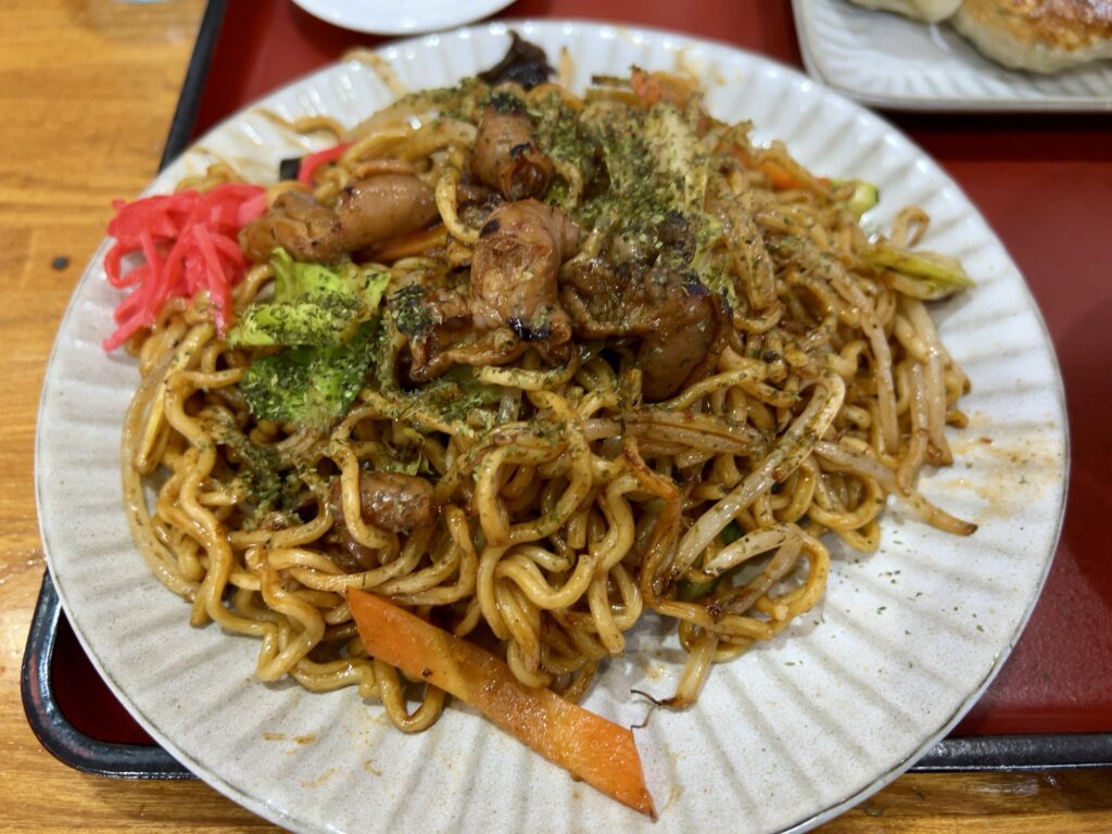 見た目は普通のソース焼きそばですが、肉の代わりにモツが入っています。